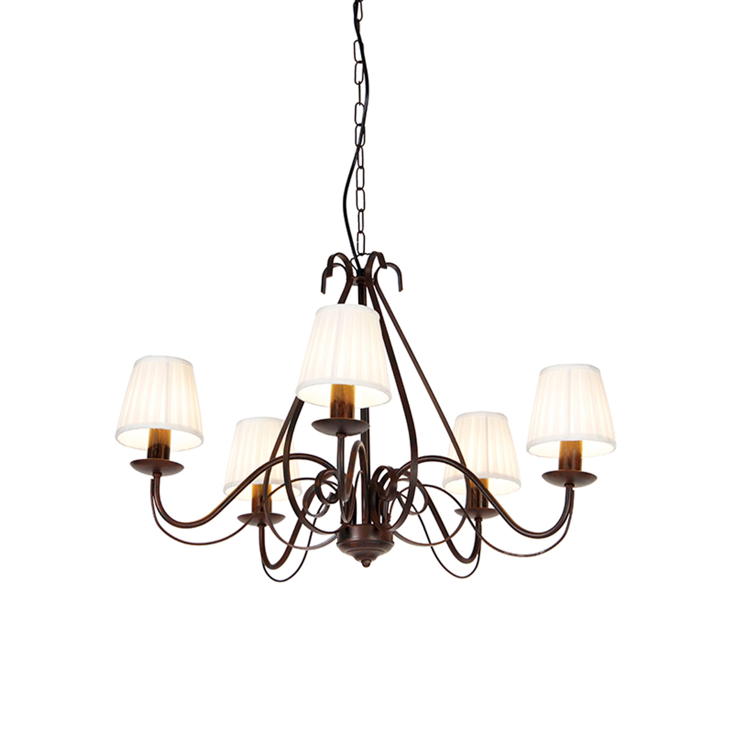 What a cute chandelier Giuseppe is! Its rusty brown colour makes the room romantic. Its pleated shades give you that nostalgic feeling. The chandelier is made of steel with fabric. The fixture is white and the clamps are cream coloured. The chandelier has a total diameter of 68 cm and a height of 110 cm. The mounting plate has a diameter of 9 cm and a height of 5 cm. The cord has a length of 60 cm. The pleated shades each have a diameter of 12 cm and a height of 11 cm. You can complete the chandelier with 5 E14 light sources (max. 40W), make sure you order these separately. The chandelier is dimmable with an external dimmer (not included), which creates even more atmosphere in the room. A really beautiful chandelier for the living room, bedroom or dining room. Brighten up your interior with the Giuseppe chandelier!