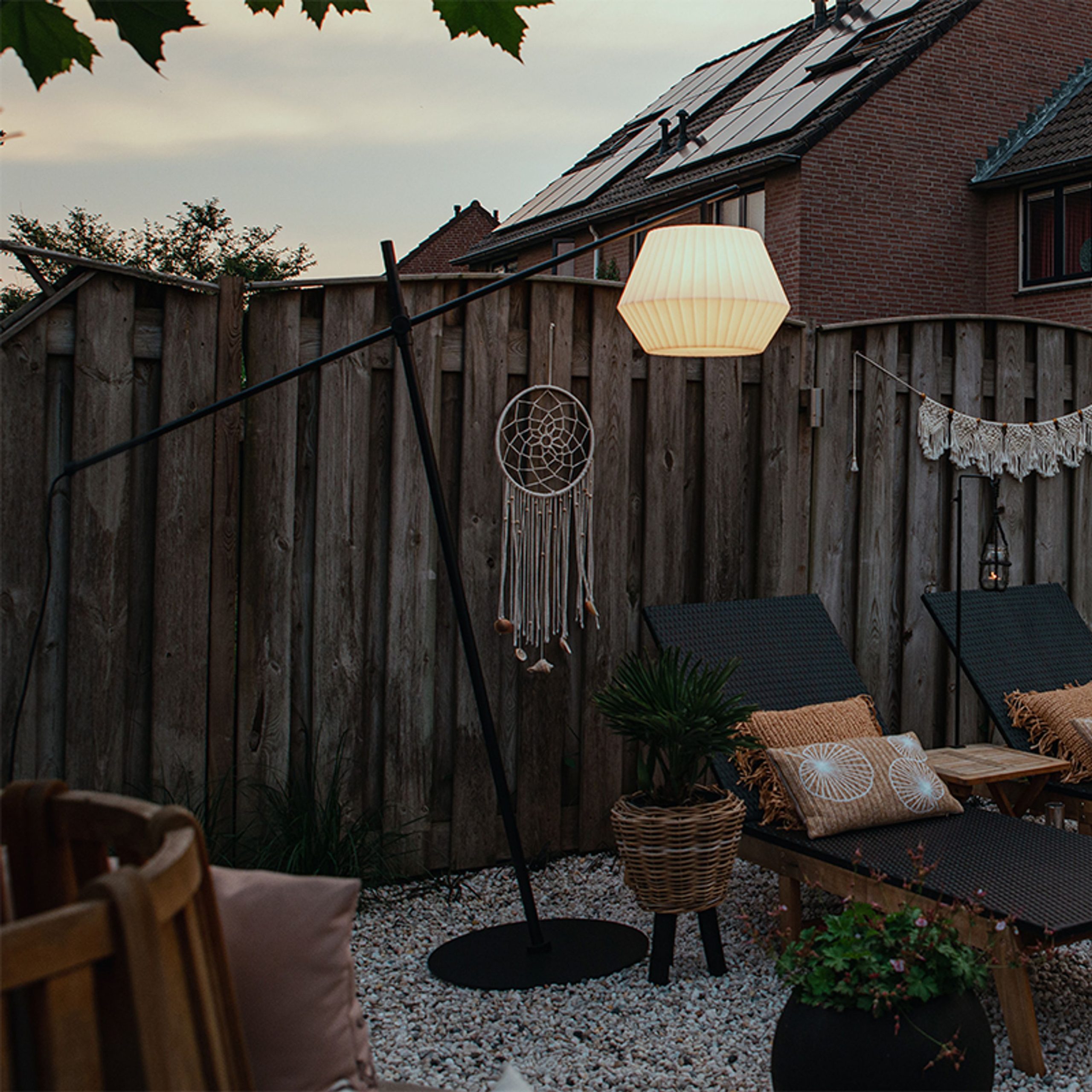 If you think a floor lamp isn’t for outdoor use, think again. A beautiful design floor lamp: perfect for by the terrace or in the lounge corner. At first glance, you wouldn’t think it was an outdoor lamp, but with an IP rating of IP44, the lamp is splash-proof. The lamp is made of black steel and aluminium with a white plastic shade. The subtle texture of the shade gives it a chic look. The shade has a diameter of 45.5 cm and a height of 32 cm. The lamp has a total height of 220 cm, length of 160 cm and width of 55 cm. The base has a diameter of 55 cm and a height of 5 cm. Robbert comes with a cord (300 cm) and plug. You can complete the lamp with a light source of max. 23W (with E27 fitting). Make sure you order this separately. The lamp is dimmable with an external dimmer (not included). A beautiful addition for by the terrace or the lounge corner. Robbert creates a cozy atmosphere outdoors.