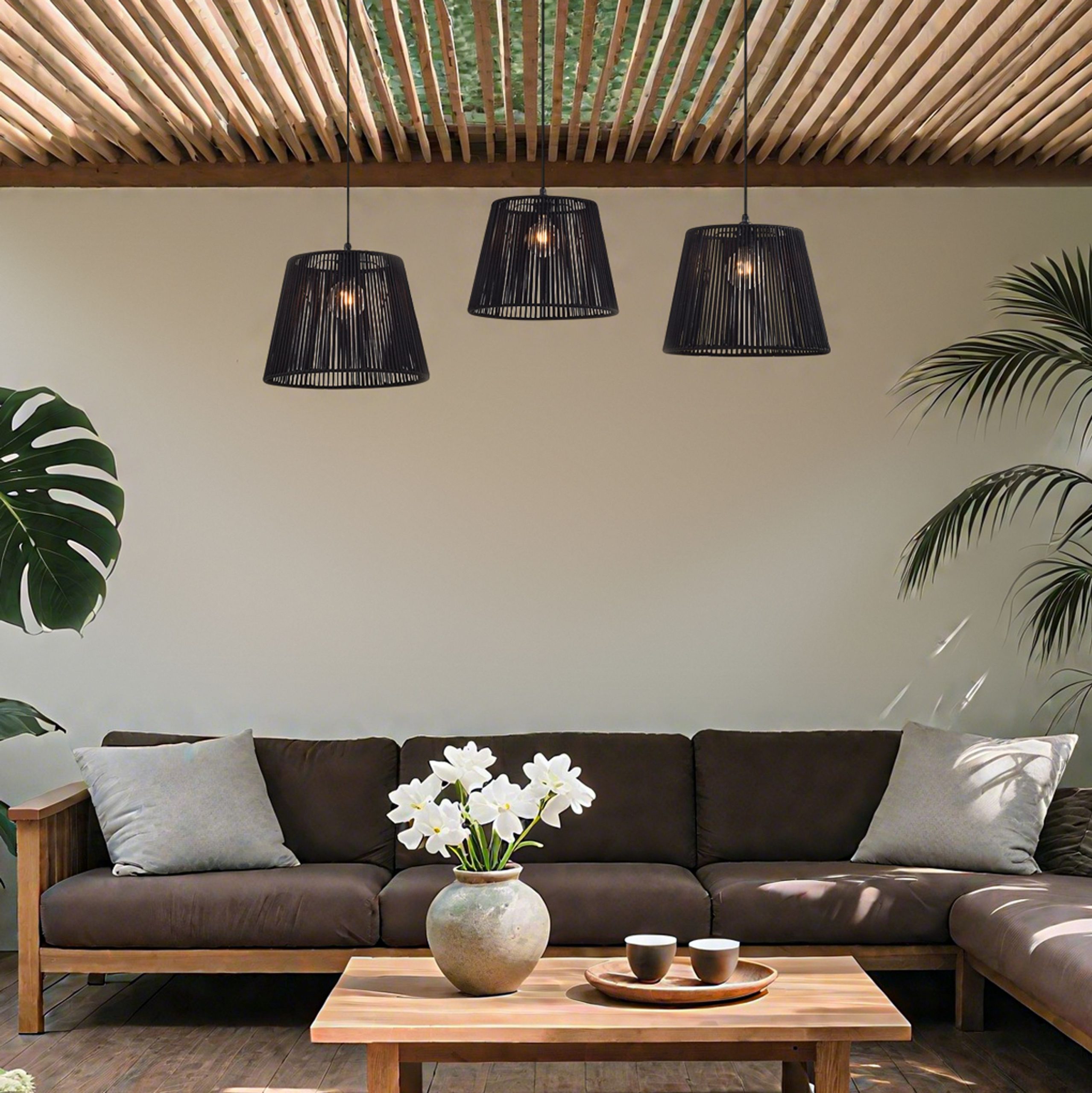 The Cava Jayla 3-light outdoor pendant lamp is a real eye-catcher for those who love a robust, natural look with a modern twist. The combination of black with braided rope gives this lamp a warm, artisanal atmosphere that fits perfectly above an outdoor table under a porch or covered terrace. The three light points ensure a balanced spread of light, giving every evening outdoors an inviting character.
