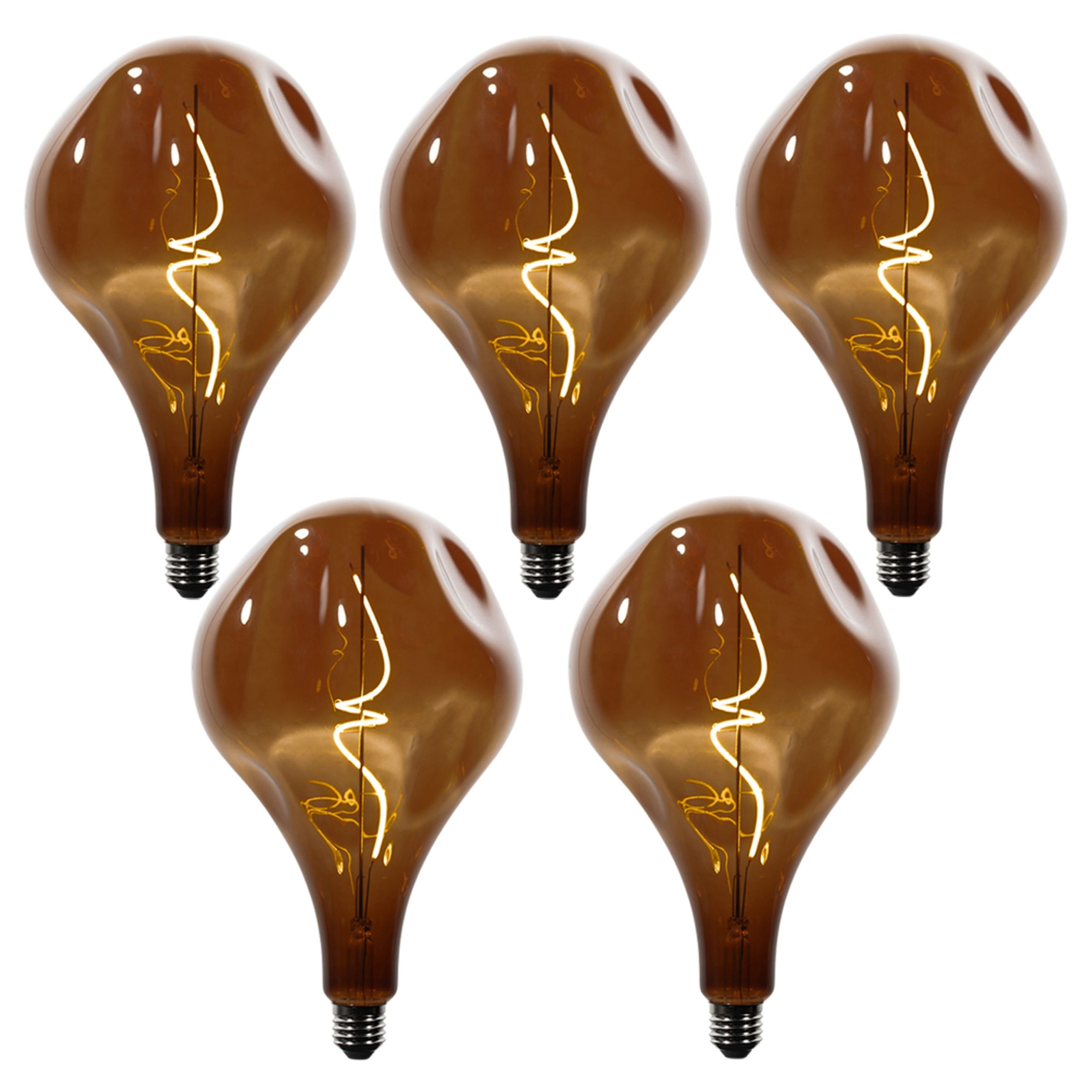 Meet the perfect mood setters for your interior: this set of five impressive PS160 LED bulbs in a warm brown hue. With their generous size and elegant, vintage look, they are not only a light source, but also a style statement. The soft, amber-coloured light (1800K) provides a warm glow that transforms any room into an oasis of peace and cosiness.